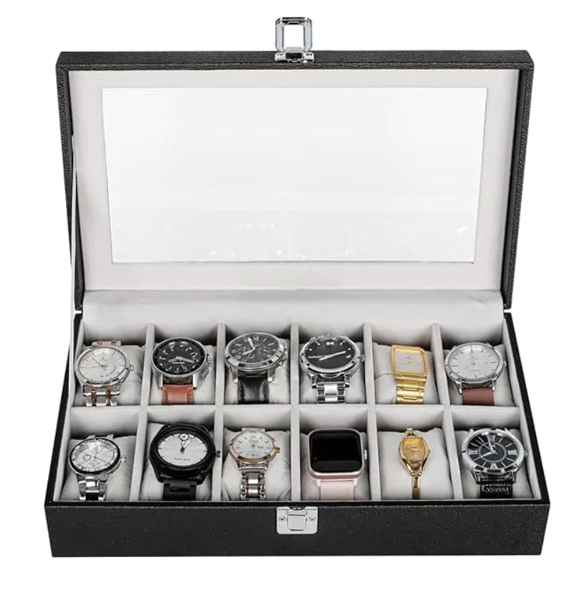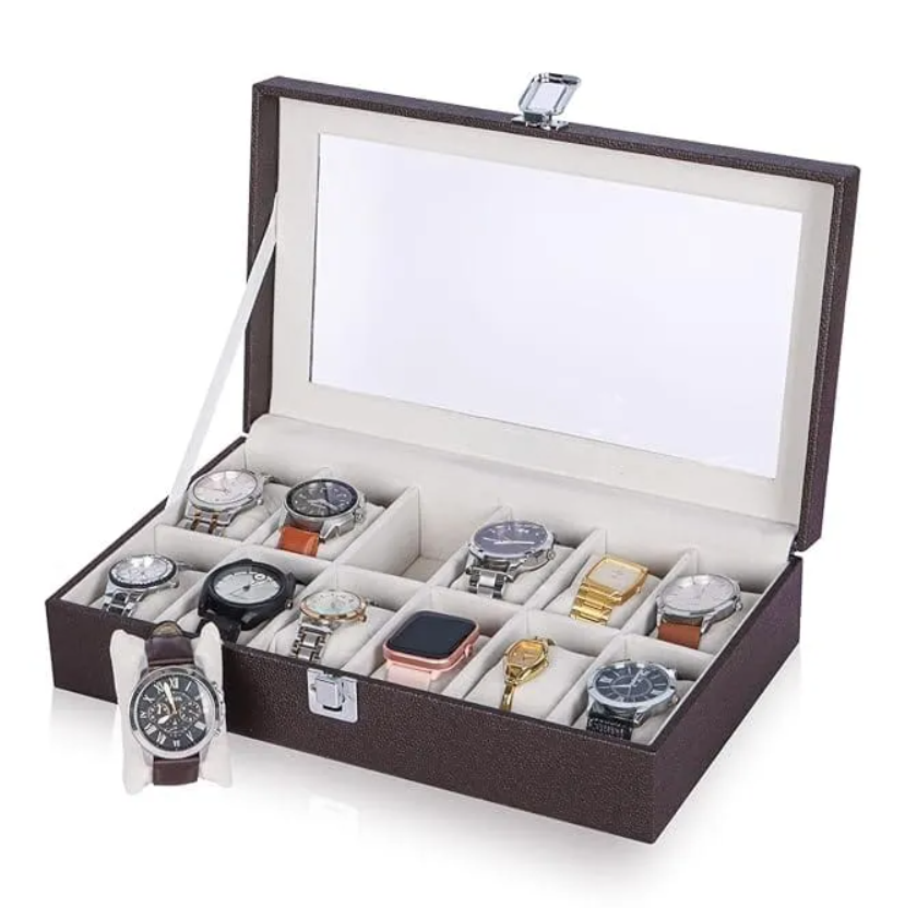 This 12-slot watch box is a perfect combination of luxury, protection, and practicality — keeping your watch collection safe from scratches and dust while enhancing your dressing space with a touch of sophistication.